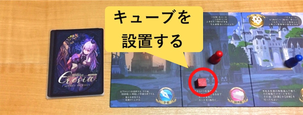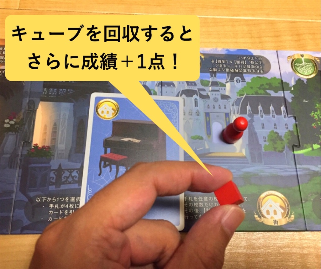 その後、今いるエリアにキューブを設置して、山札からカードを1枚補充します。同じエリアに置けるキューブは1つだけです。