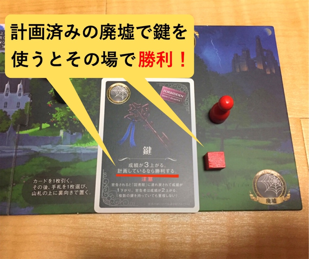 「活動」の項目でも説明しましたが、鍵を捨てて「計画」を行い、再度鍵を使用したときは特殊勝利となります。その場合、エンディングはカードの裏ではなく説明書の末尾にあるエンディングを見て下さい。