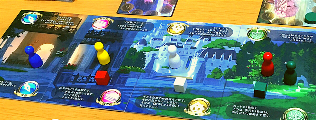 5枚の生徒カードから1枚選んで、対応した色のコマ(ポーン、マーカー、キューブ)を受け取ります。生徒カードの背景がコマの色と対応していますが、少し分かりづらいです。